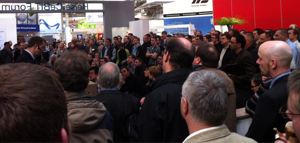 Was für ein Ansehen heise in der Industrie und bei der Leserschaft genießt, wurde mir immer wieder bei Telefonaten, Konferenzen und im Social Web bewusst – oder auch einfach am bloßen Faktum, schon einmal knapp 1.000 Kommentare unter seiner Meldung zu haben. Jetzt gerade kann man das auch gut bei der CeBIT beobachten: Während es vor vielen Bühnen eher überschaubar zugeht, stehen die Leute am heise-Stand bis in den Gang hinein (Foto von Dienstag).